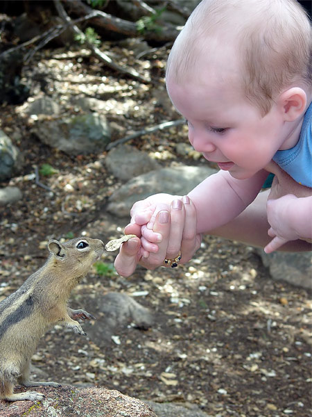 A baby feeds a Golden-mantled Ground Squirrel on top of Prospect Mountain in Estes Park, Colorado (near the Rocky Mountain National Park). These squirrels have body stripes like chipmunks, but no head stripes; their head and shoulders are coppery-red. Scientific classification: