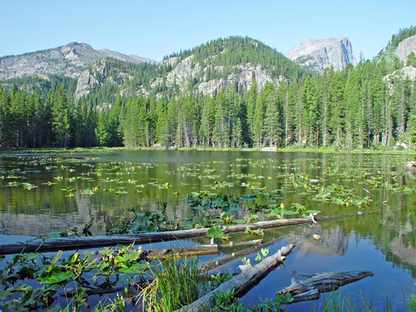Nymph Lake, with Otis Peak (left, 12,486 ft) and Hallett Peak (right, 12,713 ft); Rocky Mountain National Park, Colorado. |