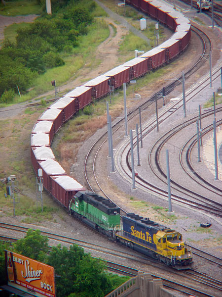 Santa Fe Railroad train and train tracks. This is the Texas and Pacific Railroad in downtown Dallas, Texas. In the lower right corner of this photo is the "Triple Underpass" bridge next to Dealey Plaza. |