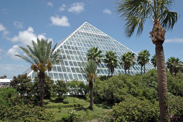 At Moody Gardens in Galveston, TX, the 10-story, 40,000 square foot Rainforest Pyramid houses a tropical rainforest, where visitors can view thousands of species of tropical plants, birds, fish, and bats native to the rainforests of Africa, Asia and the Americas. Situated among thousands of beautiful tropical plants and Palm Trees, the glass pyramid is located adjacent to the Moody Gardens Aquarium Pyramid. |