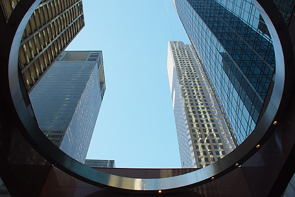 Buildings in downtown Houston, Texas. Counter-clockwise, from top-left: El Paso Energy Building, Centerpoint Energy Plaza, Enterprise Plaza, Wells Fargo Plaza. Picture taken from the street level at the Wells Fargo Plaza. |